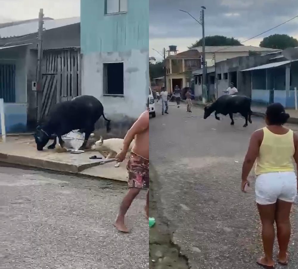 O animal fugiu do matadouro. Nas imagens, homens aparecem usando cordas para tirar o boi da casa. A cena causou alvoroço na rua, várias pessoas estavam no local vendo a cena.