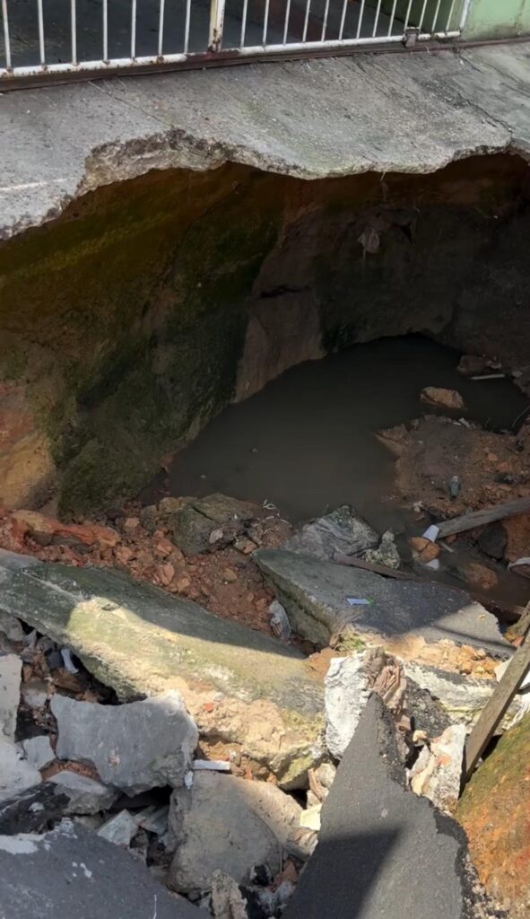 Uma enorme cratera tomou de conta da rua Papiro, no bairro Coroado, zona leste de Manaus. Moradores do local precisaram acionar a imprensa e solicitar ajuda do vereador Sargento Salazar (PL) para tentar resolver a questão que já estava colocando a vida dos moradores em risco.