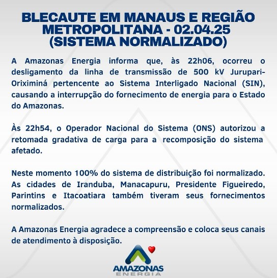Segundo a Amazonas Energia, a interrupção ocorreu as 22h08 com origem no Sistema Inteligente Nacional (SIN). De acordo com o órgão, as 22h54, o Operador Nacional do Sistema (ONS) havia autorizado o retorno gradativo da energia elétrica.
