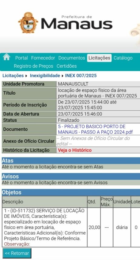 A Prefeitura de Manaus firmou um contrato sem licitação para alugar o Porto de Manaus durante o festival #SouManaus Passo a Paço 2025, que acontecerá nos dias 5, 6 e 7 de setembro no Centro Histórico. O valor pago foi de R$ 230 mil, muito acima do valor de referência registrado em documentos oficiais, que era de apenas R$ 11,5 mil.